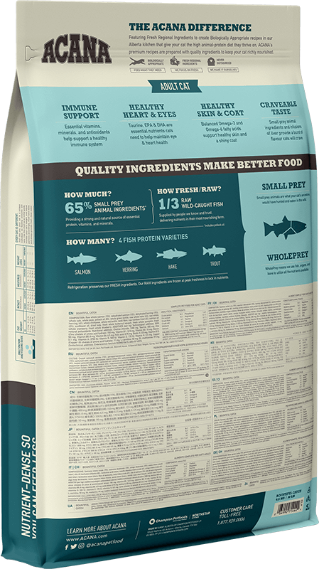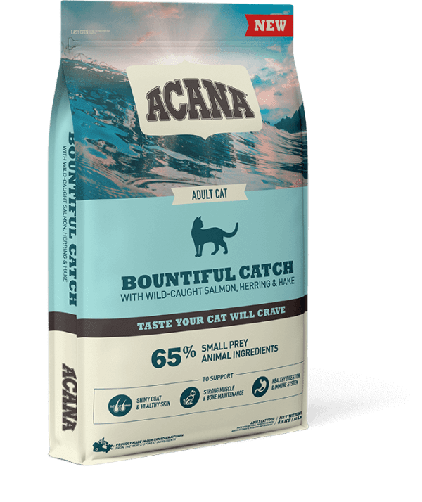 Feed your little wildcat a diet packed with whole fish ingredients. NEW ACANA Bountiful Catch is loaded with quality fish ingredients from wild-caught salmon & herring, and rainbow trout, in richly nourishing WholePrey ratios of fish, organs, and bone, so your cat is getting the nutrients they need, naturally.