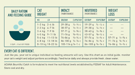 ADDITIVES (per kg) Technological additives: With natural antioxidants. Nutritional additives: Choline chloride: 1200 mg, Taurine: 400 mg, Zinc (Zinc chelate of amino acid hydrate): 150 mg, Vitamin B1: 12.5 mg, Vitamin B2: 10 mg, Niacin: 50 mg, Vitamin B5: 8 mg, Vitamin B6: 6.5 mg, Folic acid: 0.75 mg, Biotin: 0.125 mg, Vitamin B12: 0.1 mg, Vitamin A: 3750 IU, Vitamin D: 500 IU, Vitamin E: 170 IU, Vitamin K: 0.5 mg, Copper (Copper (II) chelate of amino acid hydrate): 11 mg, L-carnitine: 50 mg, DL-methionine: 99 mg. Zootechnical additives: Enterococcus faecium NCIMB10415: 600×10^6CFU. ACANA Bountiful Catch is formulated to meet the nutritional levels established by FEDIAF for Adult Maintenance.
