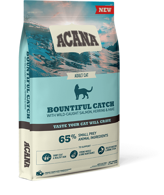 Feed your little wildcat a diet packed with whole fish ingredients. NEW ACANA Bountiful Catch is loaded with quality fish ingredients from wild-caught salmon & herring, and rainbow trout, in richly nourishing WholePrey ratios of fish, organs, and bone, so your cat is getting the nutrients they need, naturally.