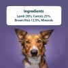 Lamb 26%, Carrots 25%, Brown Rice 12.5%, Minerals.