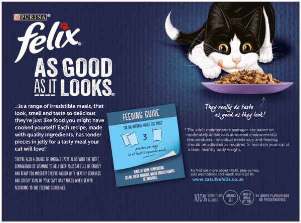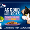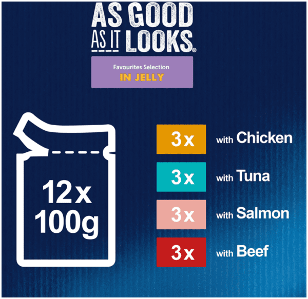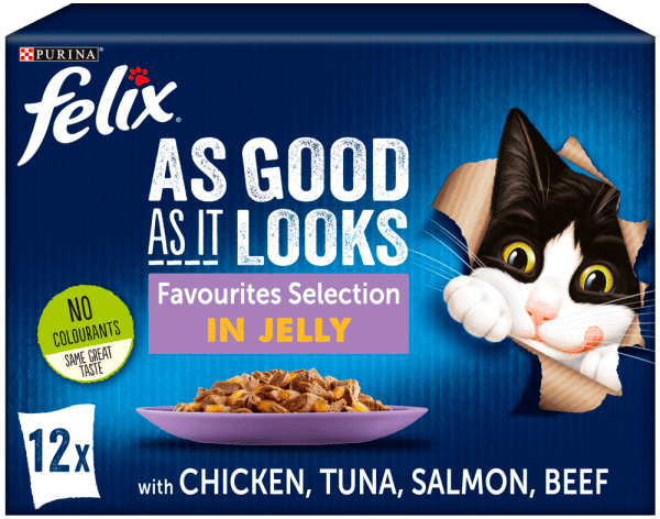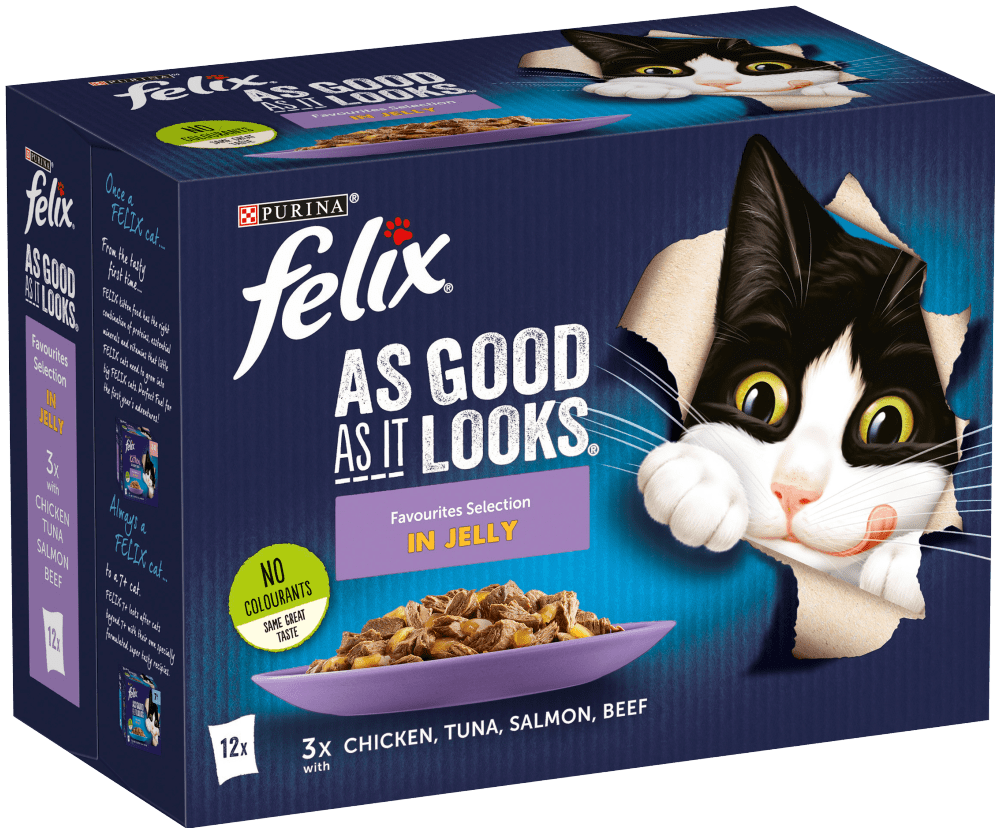 Our delicious FELIX As Good As It Looks Adult Cat Favourites Selection in Jelly is packed with irresistible flavours and tempting textures that we’re sure they will be your cat’s favourite too! In this delicious variety pack your cat can choose from the mouth-watering meat and fish recipes including beef, chicken. salmon and tuna and enjoy a different recipe at every meal. We’re sure your cat will love our carefully cooked dishes and as they’re available in individual pouches, mealtime is even more convenient than before!