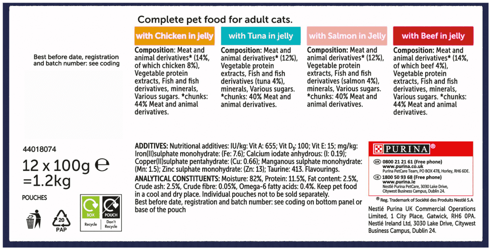 A variety of 100% nutritionally complete fish and meaty dishes for your cat to enjoy