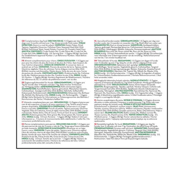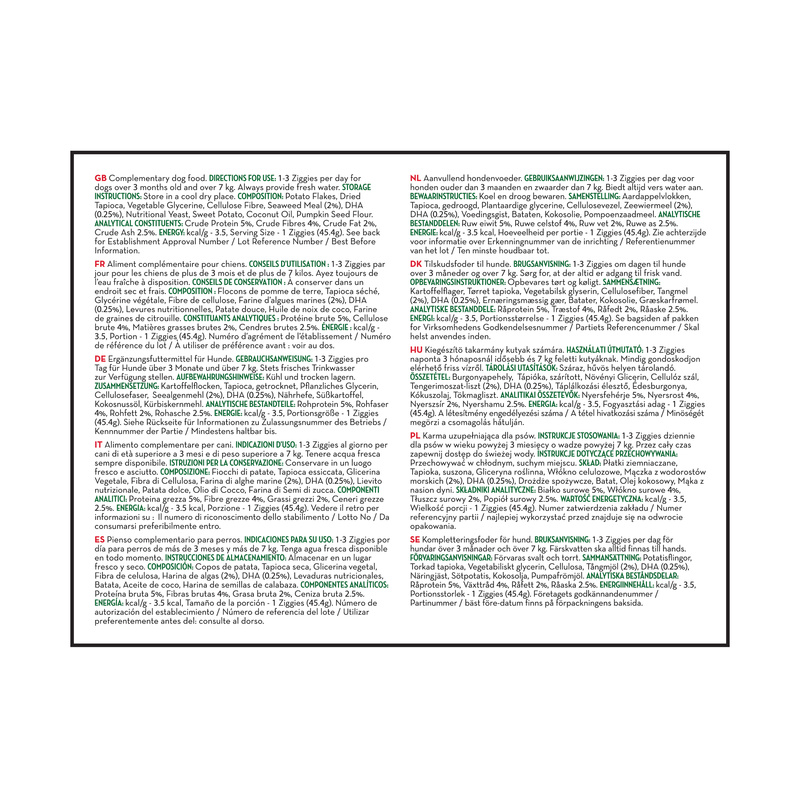 Material/ Ingredient: Potato Flakes, Vegetable Glycerine, Dried Tapioca, Cellulose Fibre, Seaweed Meal (2.5%, Source of PhytoDent™), Nutritional Yeast, Sweet Potato, Pumpkin Seed Flour, Parsley, Flaxseed, Canola Oil, Carrot, Peppermint.