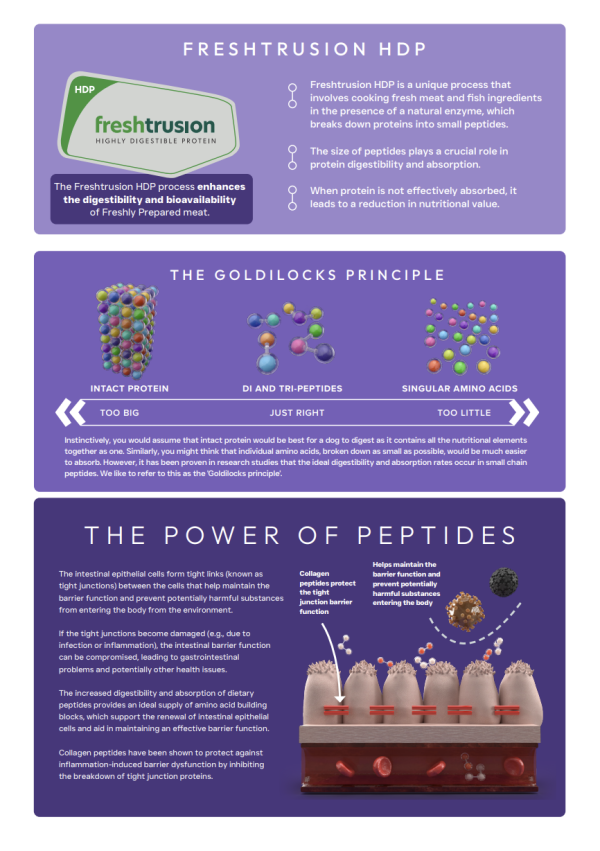 Freshtrusion HDP is a unique process that involves cooking fresh meat and fish ingredients in the presence of a natural enzyme, which breaks down proteins into small peptides. The size of peptides plays a crucial role in protein digestibility and absorption. When protein is not effectively absorbed, it leads to a reduction in nutritional value.