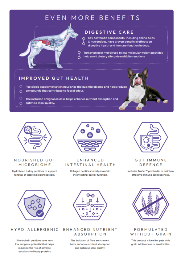 - Nourished Gut Microbiome – Hydrolysed turkey peptides to support renewal of intestinal epithelial cells.