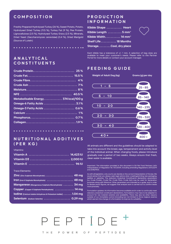 Freshly Prepared Hydrolysed Turkey (26 %), Sweet Potato, Potato,