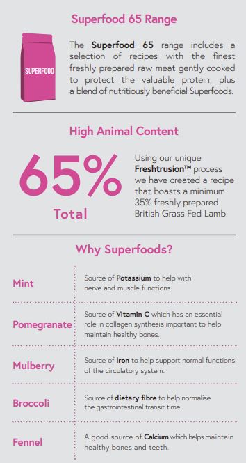 The Superfood 65 range includes a selection of recipes with the finest freshly prepared raw meat gently cooked to protect the valuable protein, plus a blend of nutritiously beneficial Superfoods. Using our unique