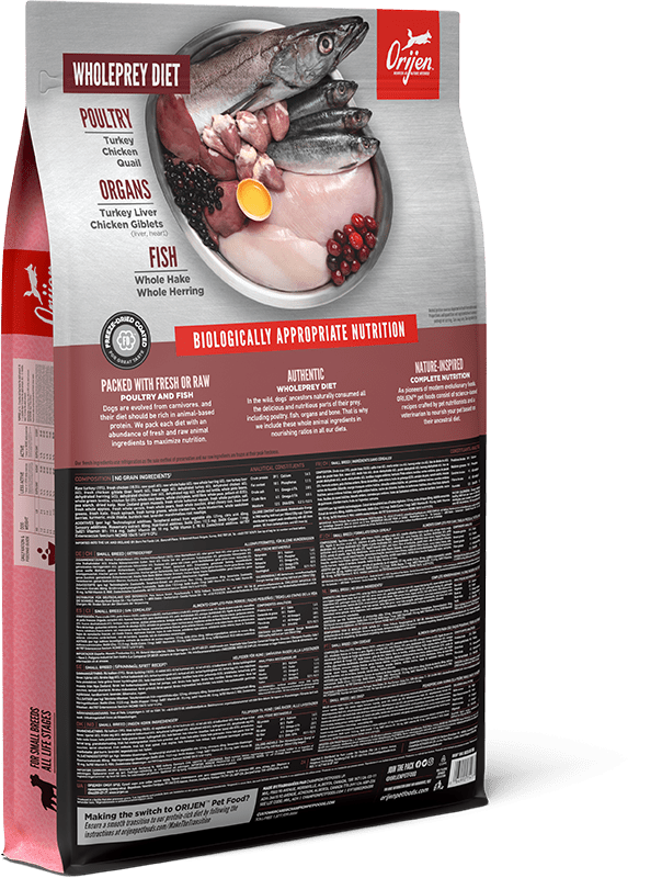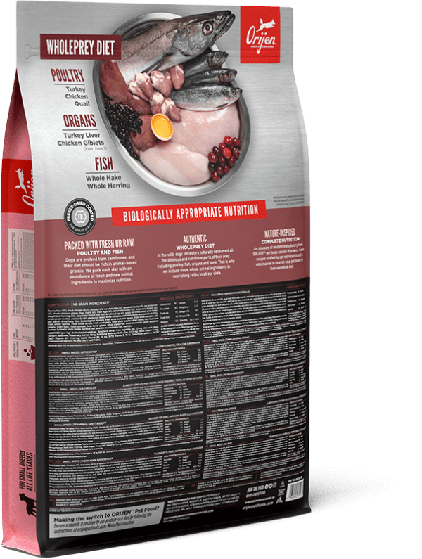Help your dog thrive with the power of protein-rich recipes that provide peak nourishment. Your small-breed dog has certain nutritional needs and requires a Biologically Appropriate diet in order to thrive. ORIJEN™ Small Breed diet is made specifically for smaller dogs, with nourishing protein from free-run* chicken and turkey, wild-caught fish and quail all packed into a unique kibble shape that is easier for them to eat. Packed with fresh or raw** WholePrey animal ingredients, ORIJEN food is made with the most nutrient-dense, succulent parts of the prey to deliver the nutrition dogs need. The result is a diet for your small canine companion that is beyond comparison.