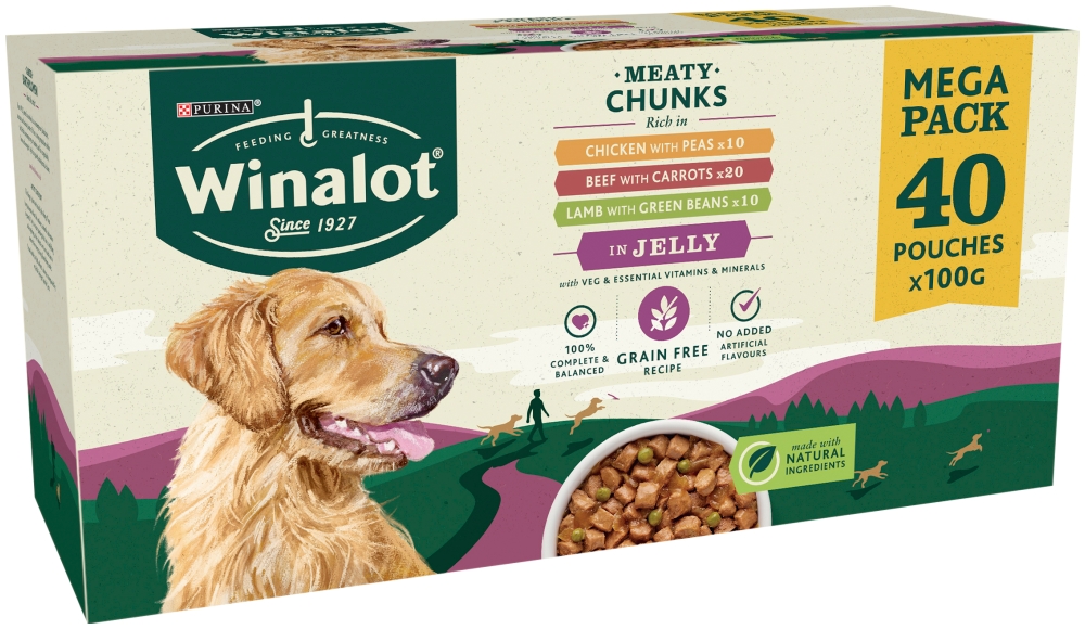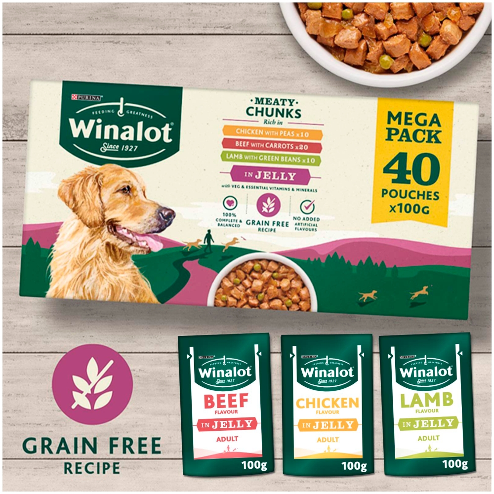 This pack contains 40x100g servings of Winalot Meaty Chunks In Jelly.