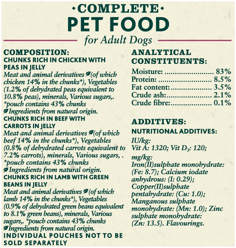 - Product Ingredients:The pack contains 44 ingredients that are carefully selected and crafted into the delicious meaty chunks in jelly meal that dogs love.